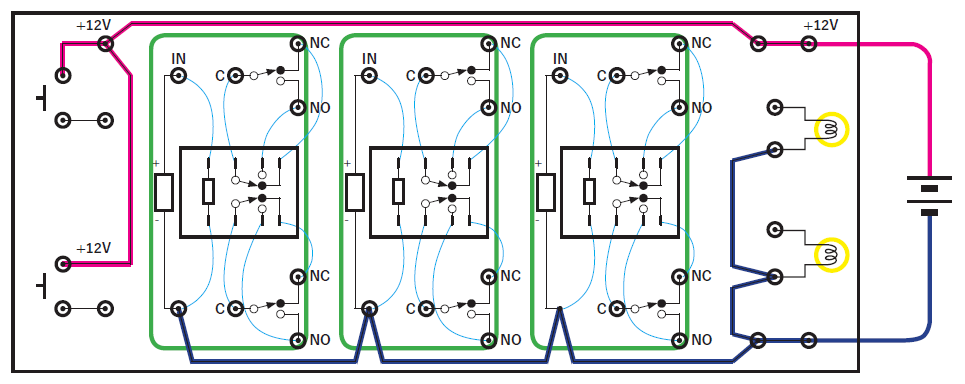 Before building AND and OR circuits with relays, I draw a closed circuit with a battery and light bulb on the blackboard and have students think about how to arrange two switches to create an AND circuit. This should be relatively easy to figure out. The OR circuit is slightly more challenging, but some students will still discover it. Then I have them realize that these represent the difference between series and parallel connections.