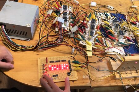 Following this introduction, we tackle electromagnetic switches called relays. By combining these, we learn the principles of the adder while steadily building a large apparatus. Along the way, we experiment with clock circuits that give the computer its rhythm, memory circuits, and telegraph devices. The initially simple circuit gradually becomes increasingly complex.