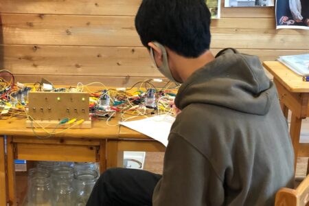 Finally, an adder capable of calculating three-digit binary numbers was completed, and we verified it by flipping switches back and forth. Then, as the finishing touch, we connected a homemade device called a sequencer. When it automatically fed in the combinations of numbers we had been setting manually just moments before, the device suddenly began to resemble a computer. One student wrote in his notebook, “For me, who understands how it works, it’s becoming a fun ‘toy’.”