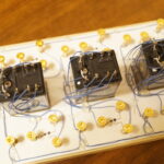 空中配線による実習で、回路図と実際の配線の関係性を理解できたら、以後はワークベンチを使って作業を進めます。わたしが作ったのは、リレーを3台搭載し、2つのスイッチと2つの抵抗内蔵型LEDランプ(定格電圧12V)を備えたワークベンチです。